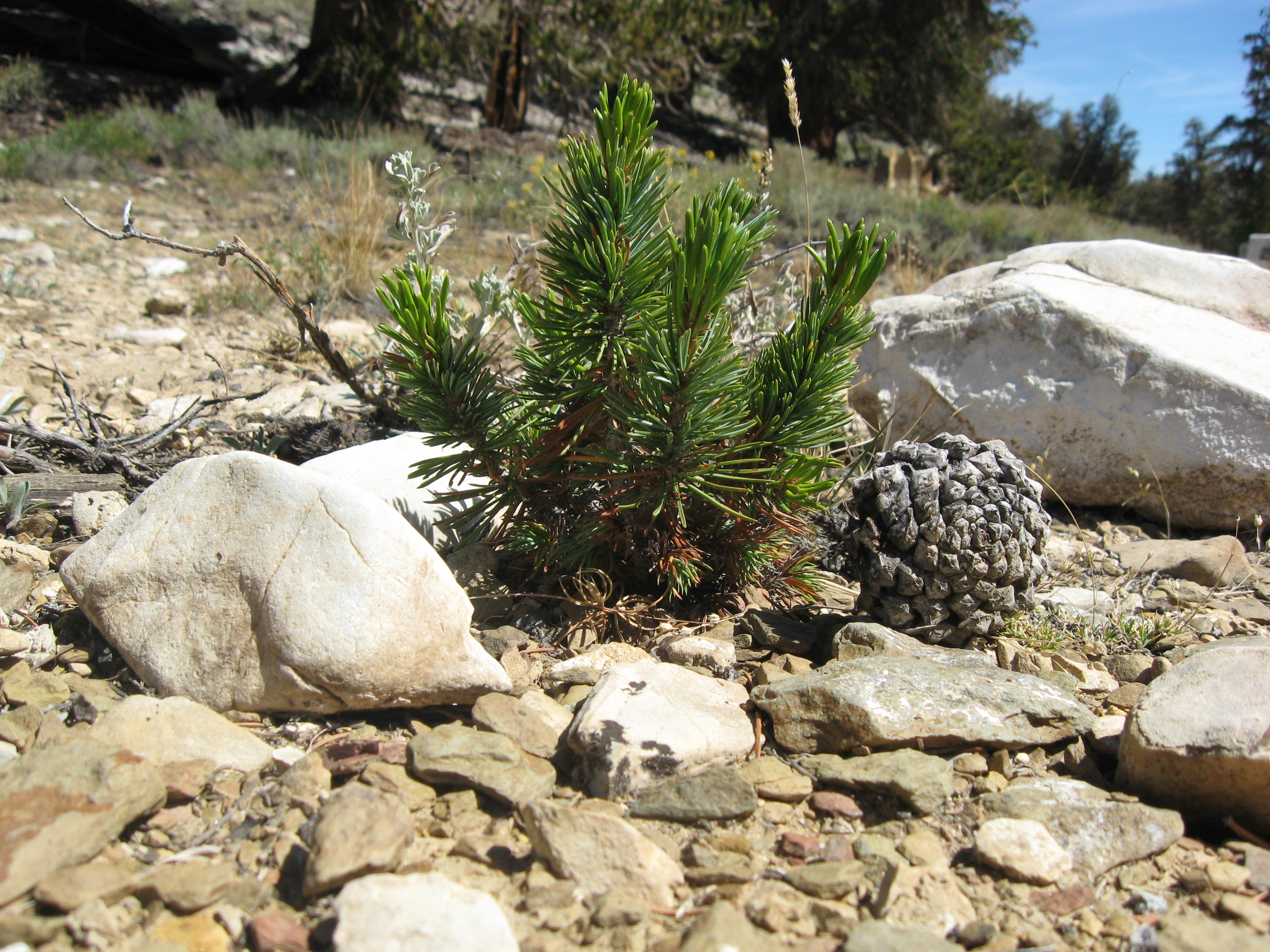 I was struck by the contrast of a slow-growing youngster. A ranger showed me the tree in the next photograph. Seen here beside a cone from a mature tree, this tiny sapling was four inches tall–and 10 years old.