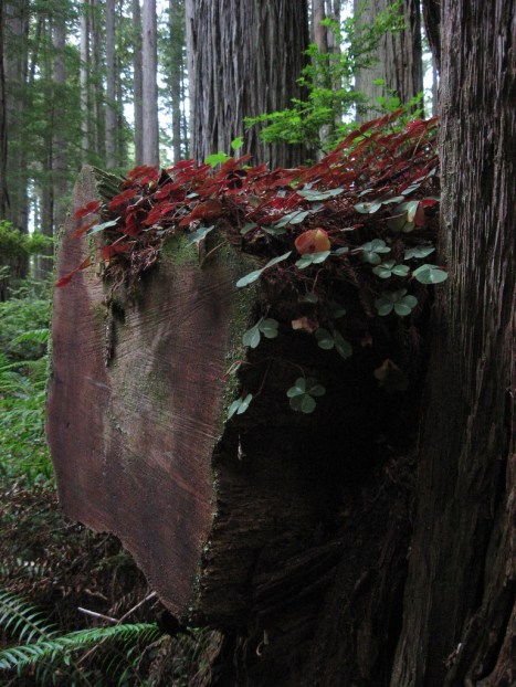 I was struck by the contrast of the red undersides of the redwood sorrel against the green of the upper surface and the color of the fallen log.