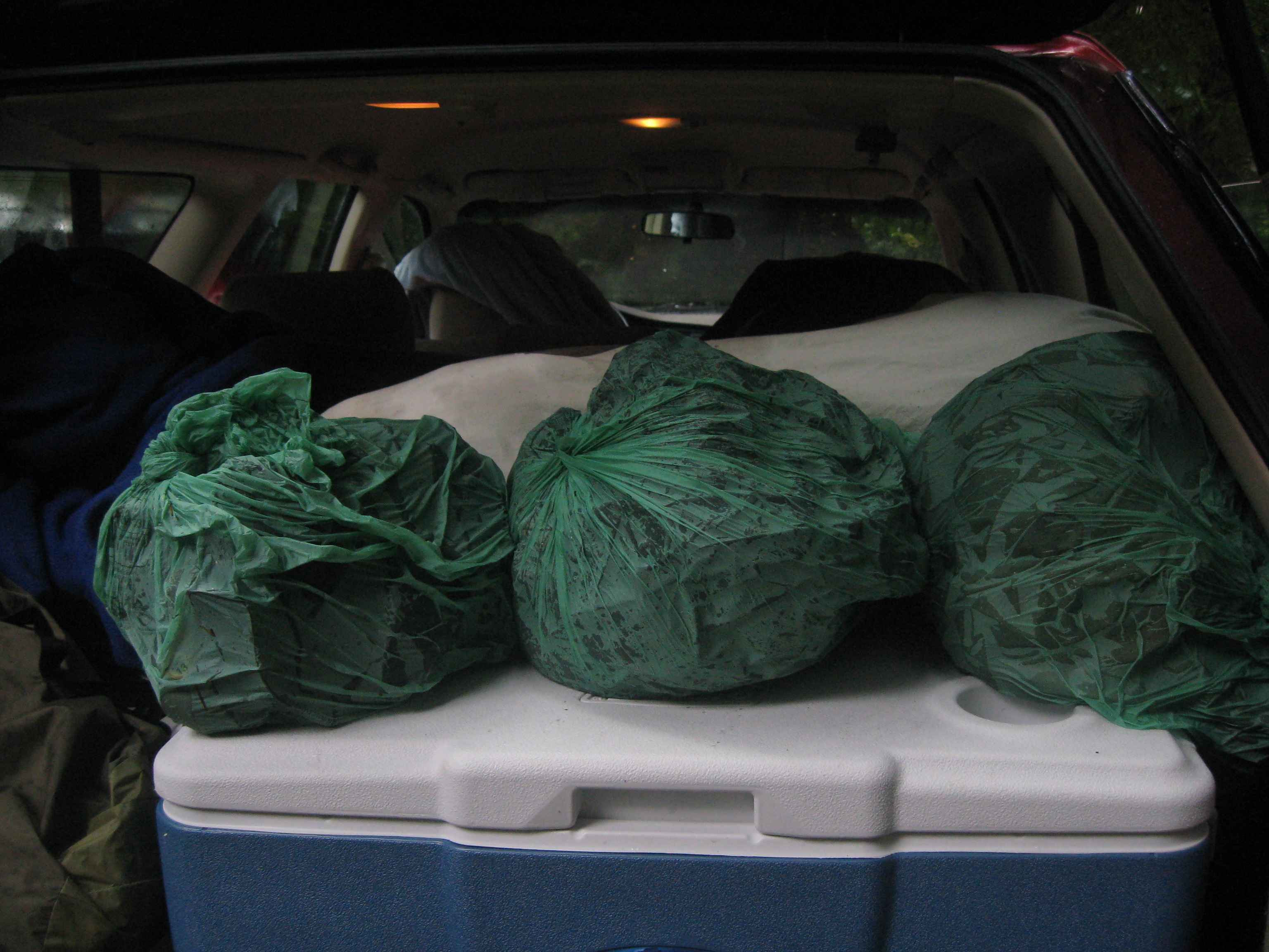 The mess of my tent after the first of 12 record-setting days of storms—one bag each for the soaked and muddy body, rainfly and ground cloth (yes, I headed indoors)