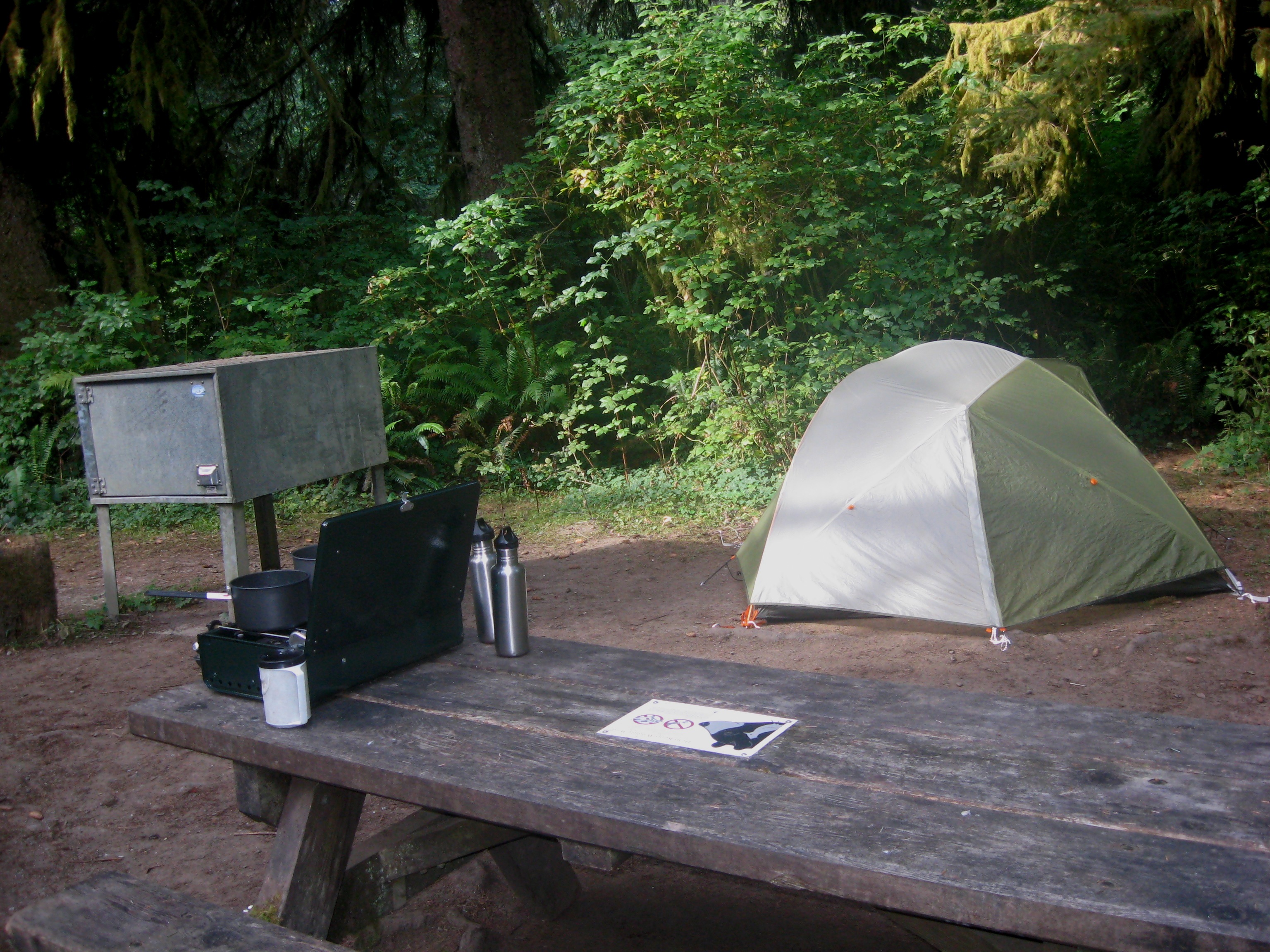 Prairie Creek campsite 44 9-2013This was the kitchen, living room and bedroom. The sign on the table reminds campers to properly store food and remove crumbs to keep wildlife wild.