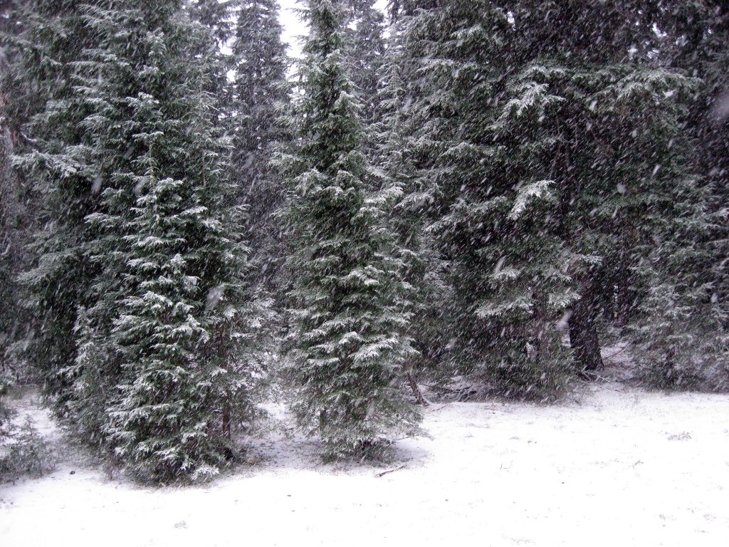The clouds rolled back in. At first there were just a few flurries, but soon the wind picked up and the snow fell in large flakes. It was time to turn around. I took a last photo of the trees in the storm before it got too wet for my camera.