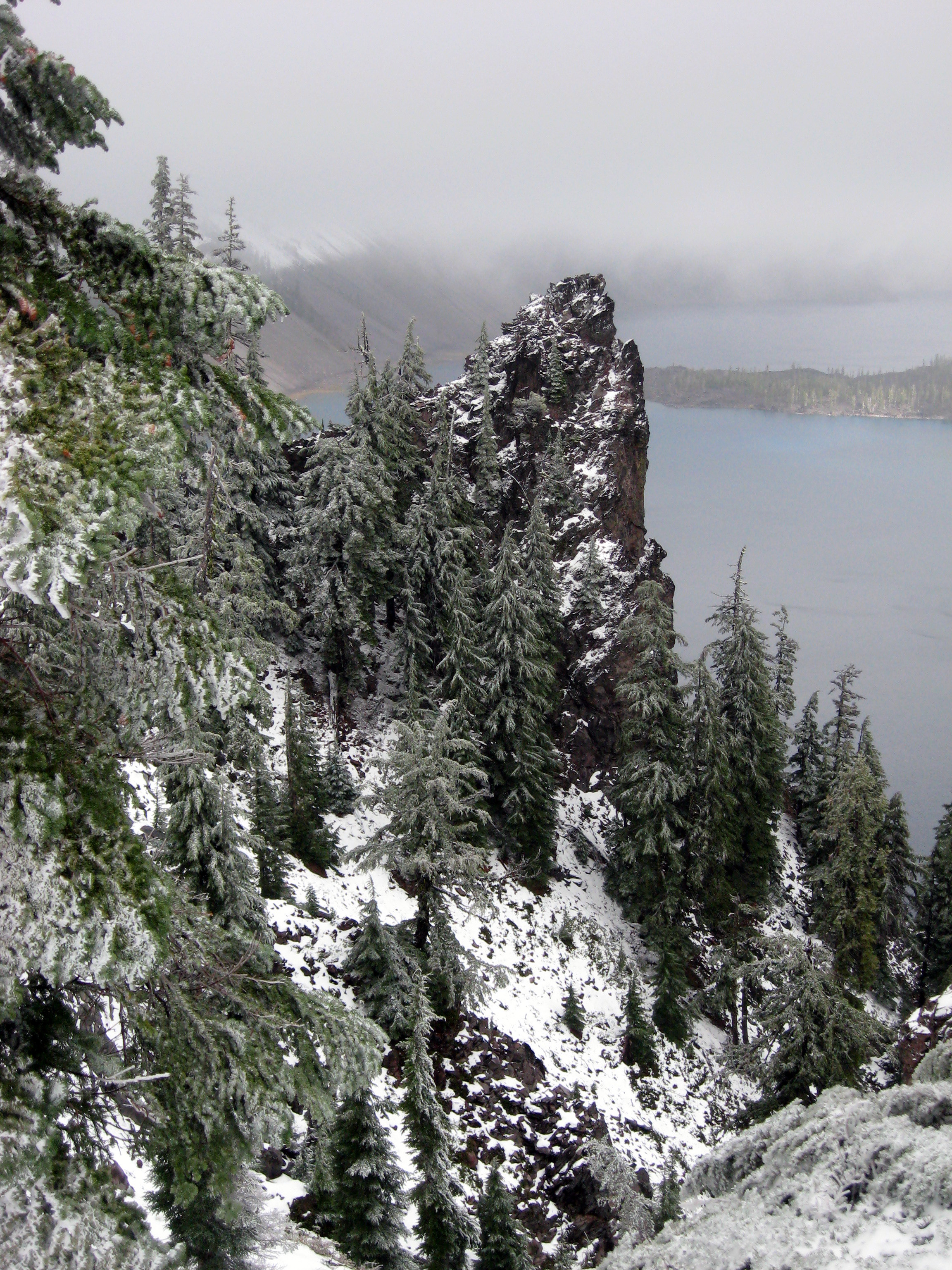 Rock outcrop in snow Crater Lake 10-1-13Outcrop with Wizard Island in the background