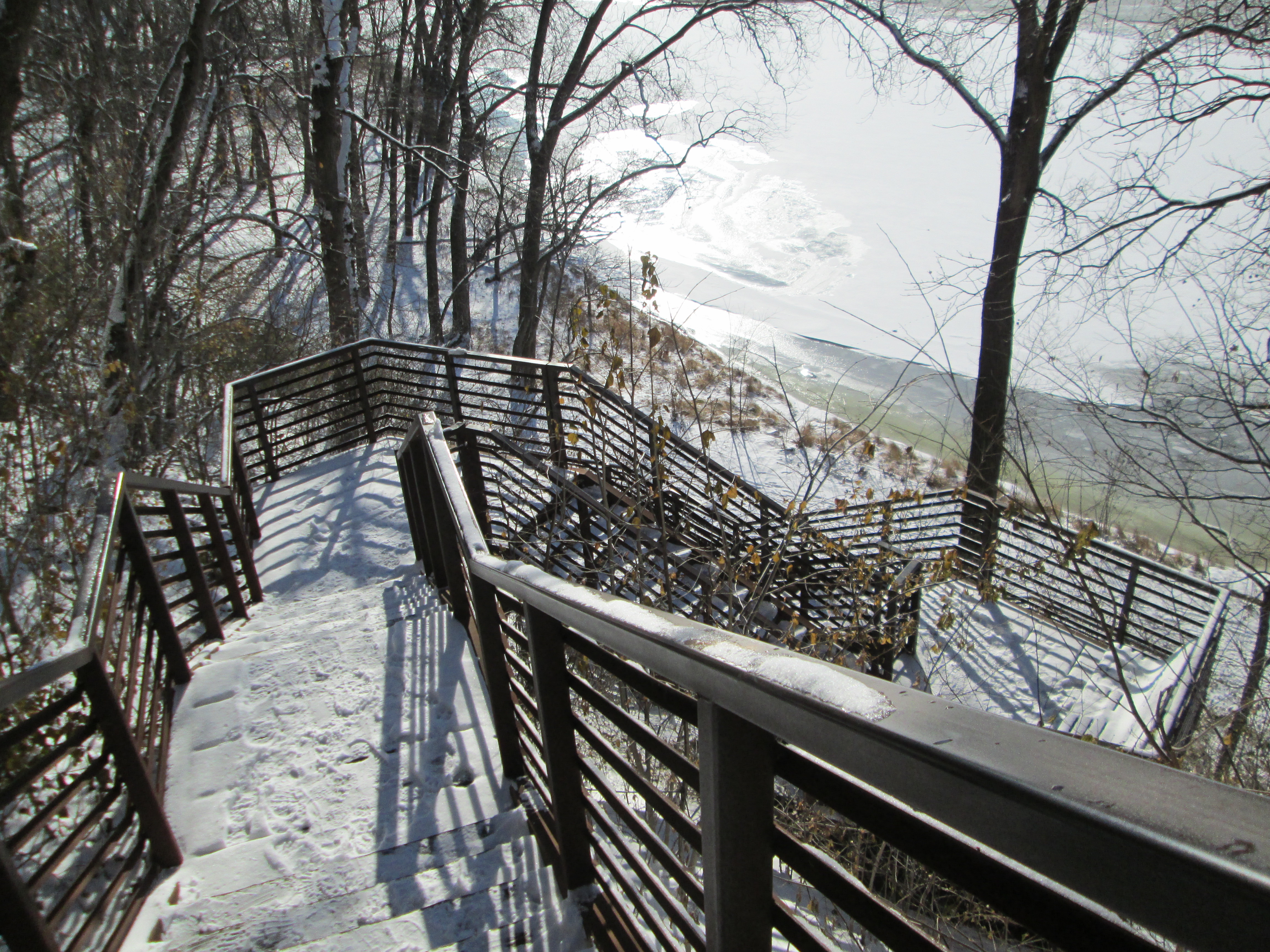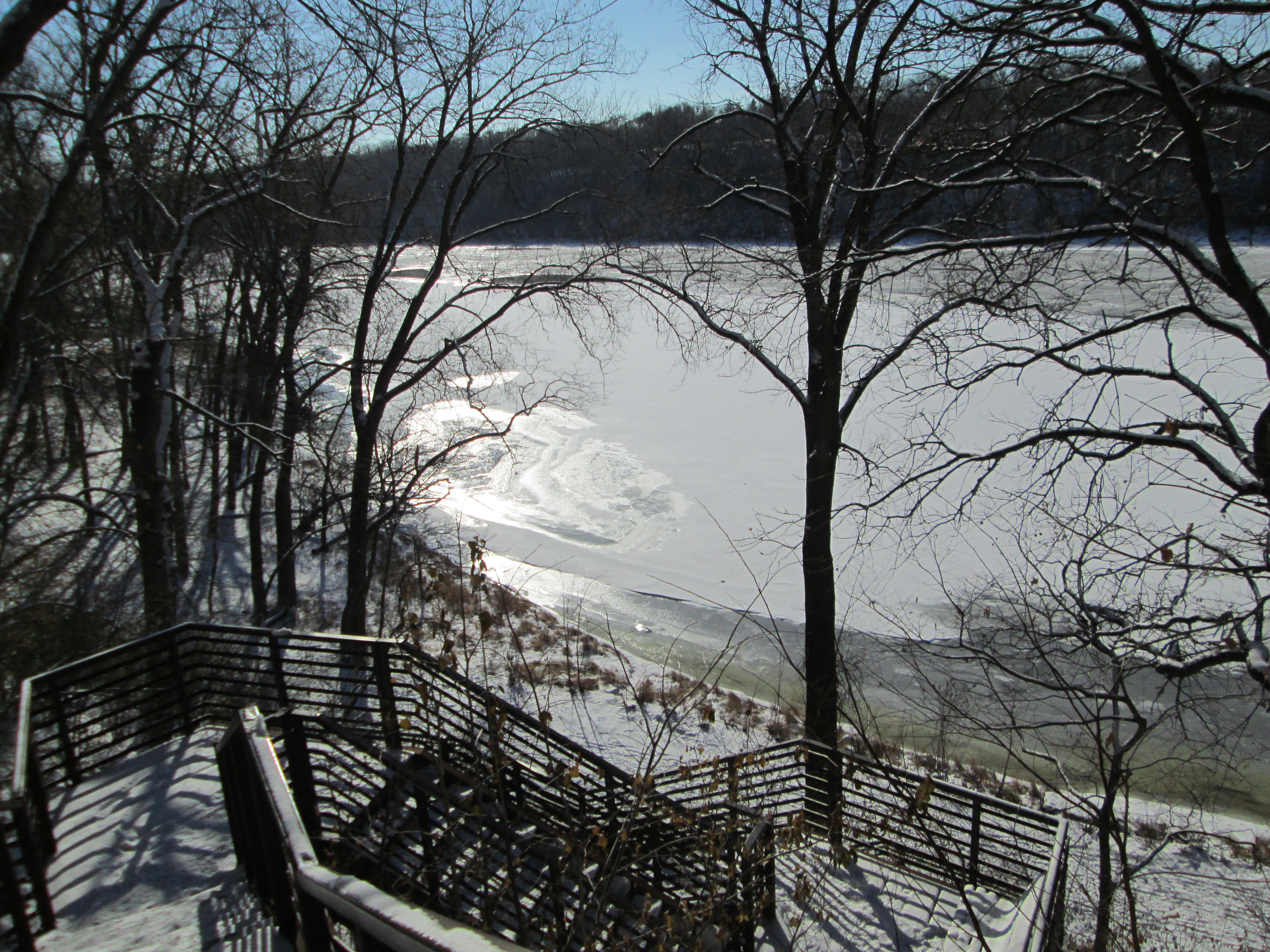 I was delighted to be outdoors in the quiet solitude of the morning. It had been so cold that there was no open water in the broad channel, with solid ice along the banks and mini floes in the middle. I descended down the long stairway to the river’s edge.