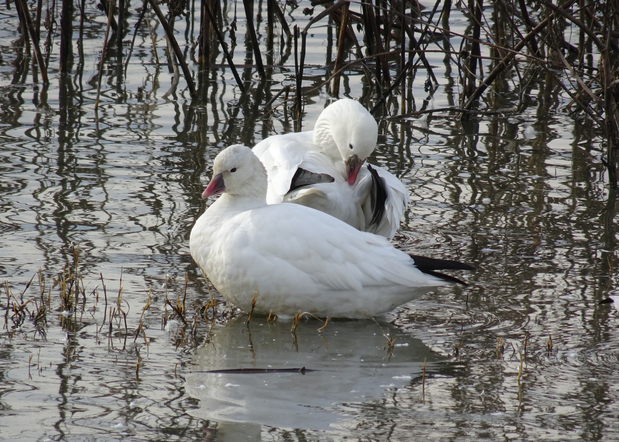 Eager not to miss their fly-off at dusk with the sound of thousands of wings beating together at once, I headed north on the rural back roads, passing miles of flooded rice fields post-harvest, scanning in all directions. And there they were—snow geese.