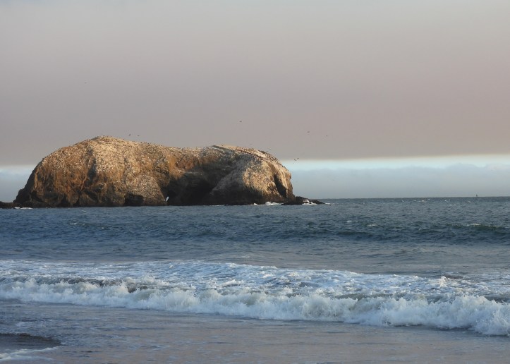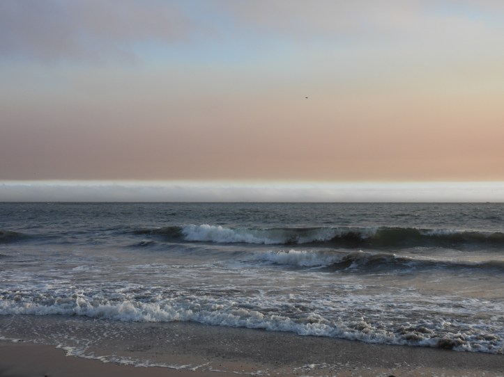 I arrived at Rodeo Beach. Walking on the sand toward the waves, I looked across the ocean as I have countless times. But never had the sky looked like this. There was the fog, hovering over the water miles away. A thin strip of blue sky was visible above it, and on top was a giant layer of smoke drifting above and heading out to sea.