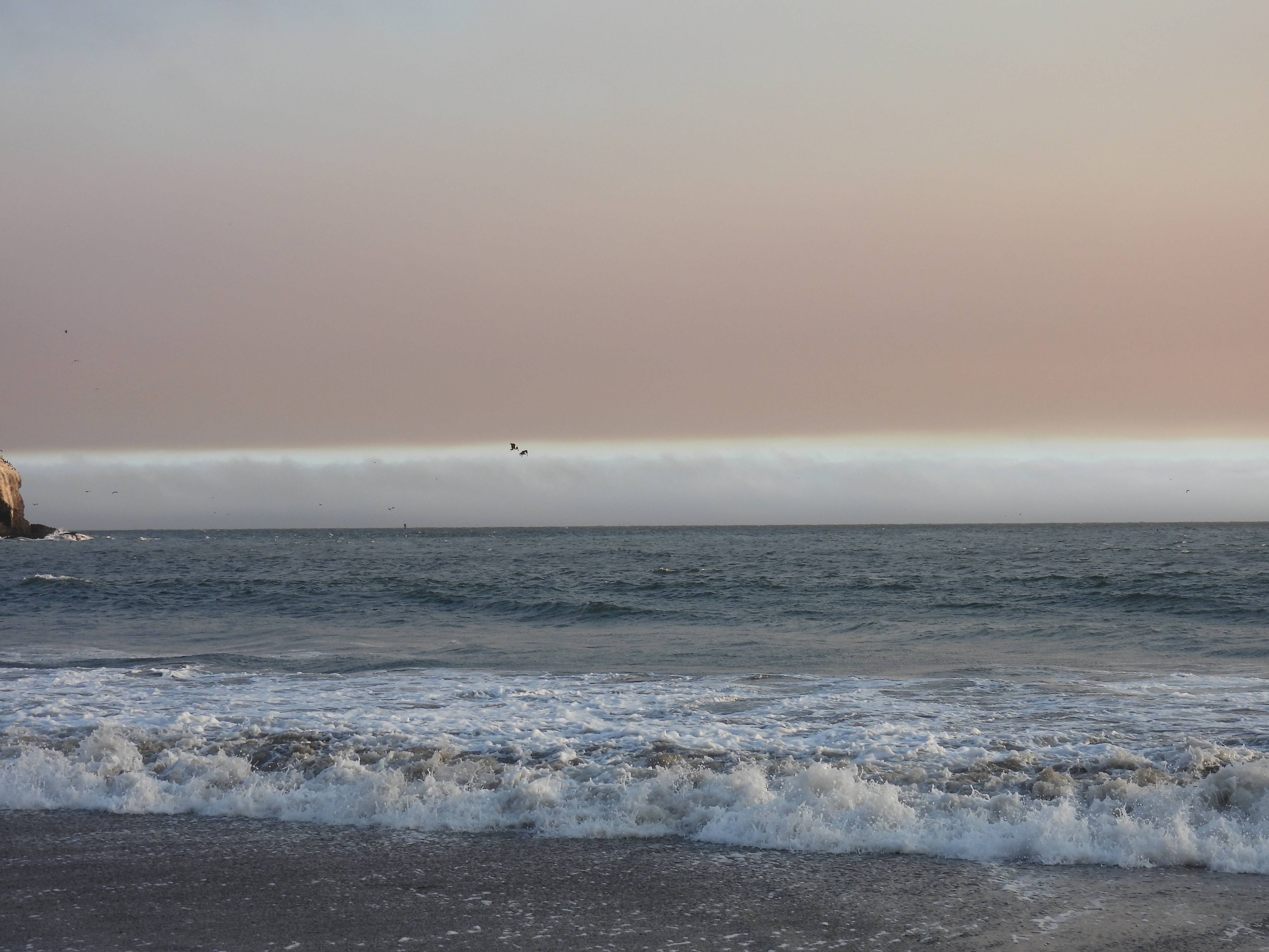 I arrived at Rodeo Beach. Walking on the sand toward the waves, I looked across the ocean as I have countless times. But never had the sky looked like this. There was the fog, hovering over the water miles away. A thin strip of blue sky was visible above it, and on top was a giant layer of smoke drifting above and heading out to sea.