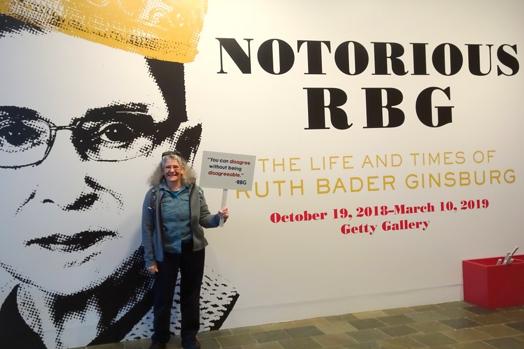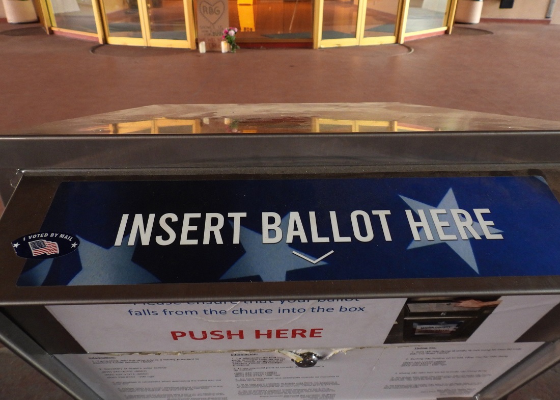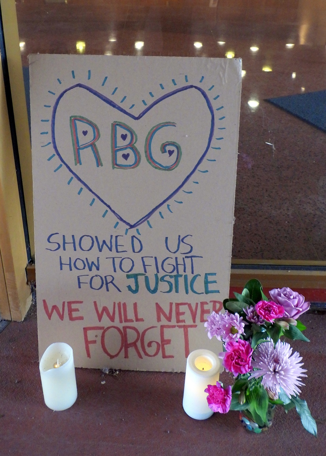 It wasn’t until after I dropped my ballot into the chute that I noticed the cardboard sign across the paved walkway, adjacent to the building’s big glass doors. Curious, I walked over to look. It was a makeshift memorial for Supreme Court Justice Ruth Bader Ginsburg. Two battery operated candles had been placed on either side. A jar had previously served as an improvised vase with water, its bottom containing brightly colored marbles. With this public entrance long closed due to the pandemic, the jar was completely dry and held the desiccated remains of what had been flowers.