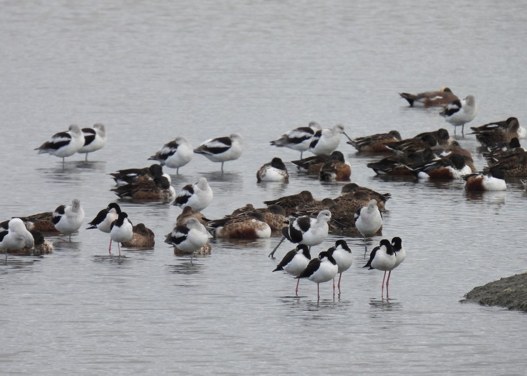 The first cluster of birds I saw were nearly all mallards, gathered in the flooded agricultural field adjacent to the constructed regional water treatment ponds at Las Gallinas Sanitary District. It’s been years since there was enough water for these natural ephemeral pools in the field. The birds there were clearly not the local mallards that beg for food in city parks, instead swimming away when they saw me get out of my car even at a significant distance.