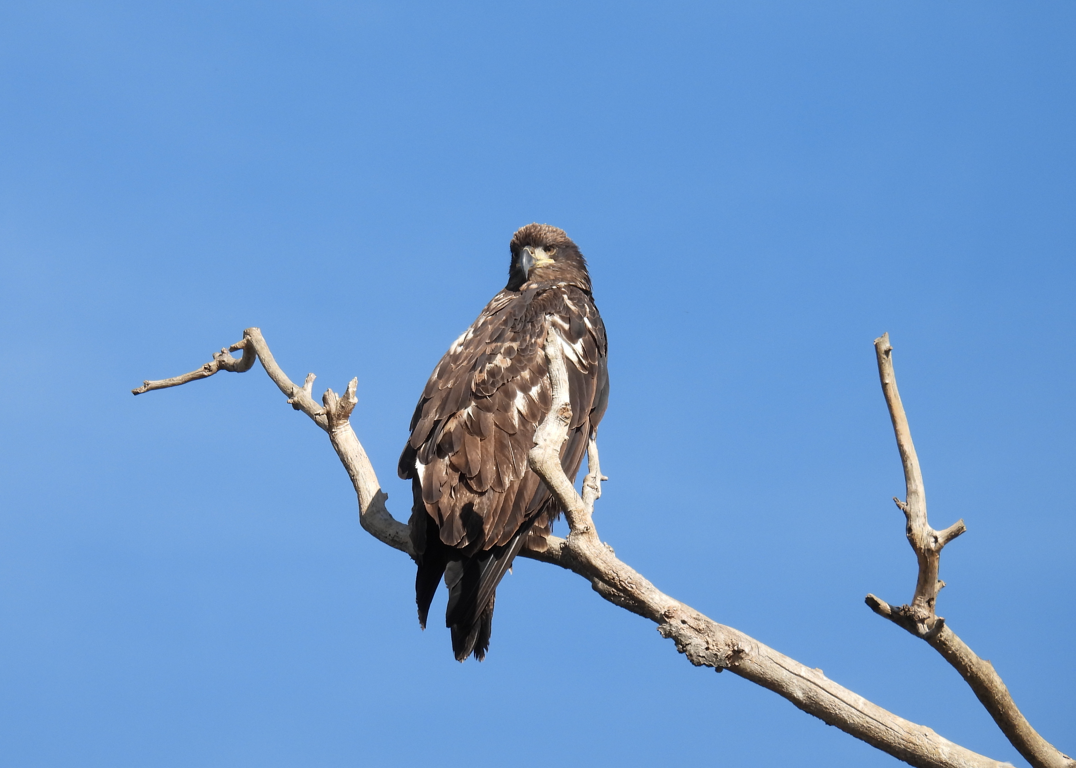 My Thanksgiving trip this year included a particularly magical encounter. I slowly drove the one-way route at Sacramento National Wildlife Refuge, where I typically travel below the maximum speed of 15. I spotted a bird of prey in a leafless tree ahead on my right. Red-tail? No, the bird was substantially larger. Not having the white head and tail, I assumed I was seeing a juvenile bald eagle, mostly brown before the adult plumage that would come later.