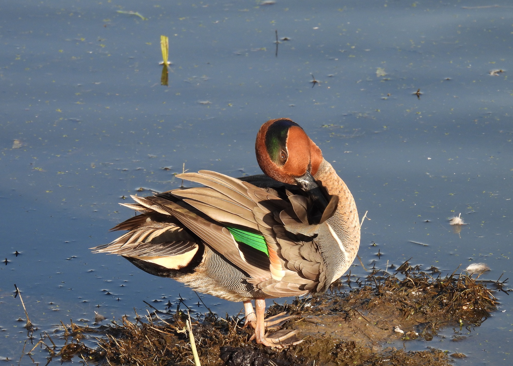 I had observed cinnamon teals many times before I noticed the drake’s bright blue feathers that were revealed when he was preening.