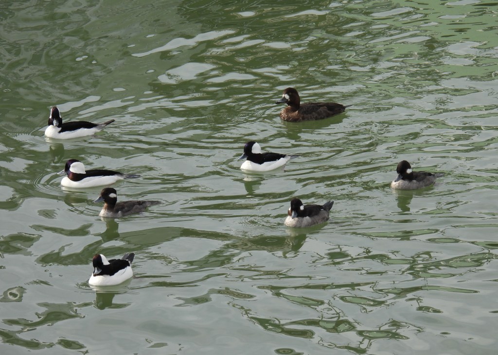 I’ve been trying for years to photograph male buffleheads, with their seemingly black feathers on their heads that become iridescent in the sun. They quickly swim away when they see people. They’re often on the surface only long enough to take a few breaths before completely submerging again in pursuit of fish, leaving me with countless images of blurry tail feathers.