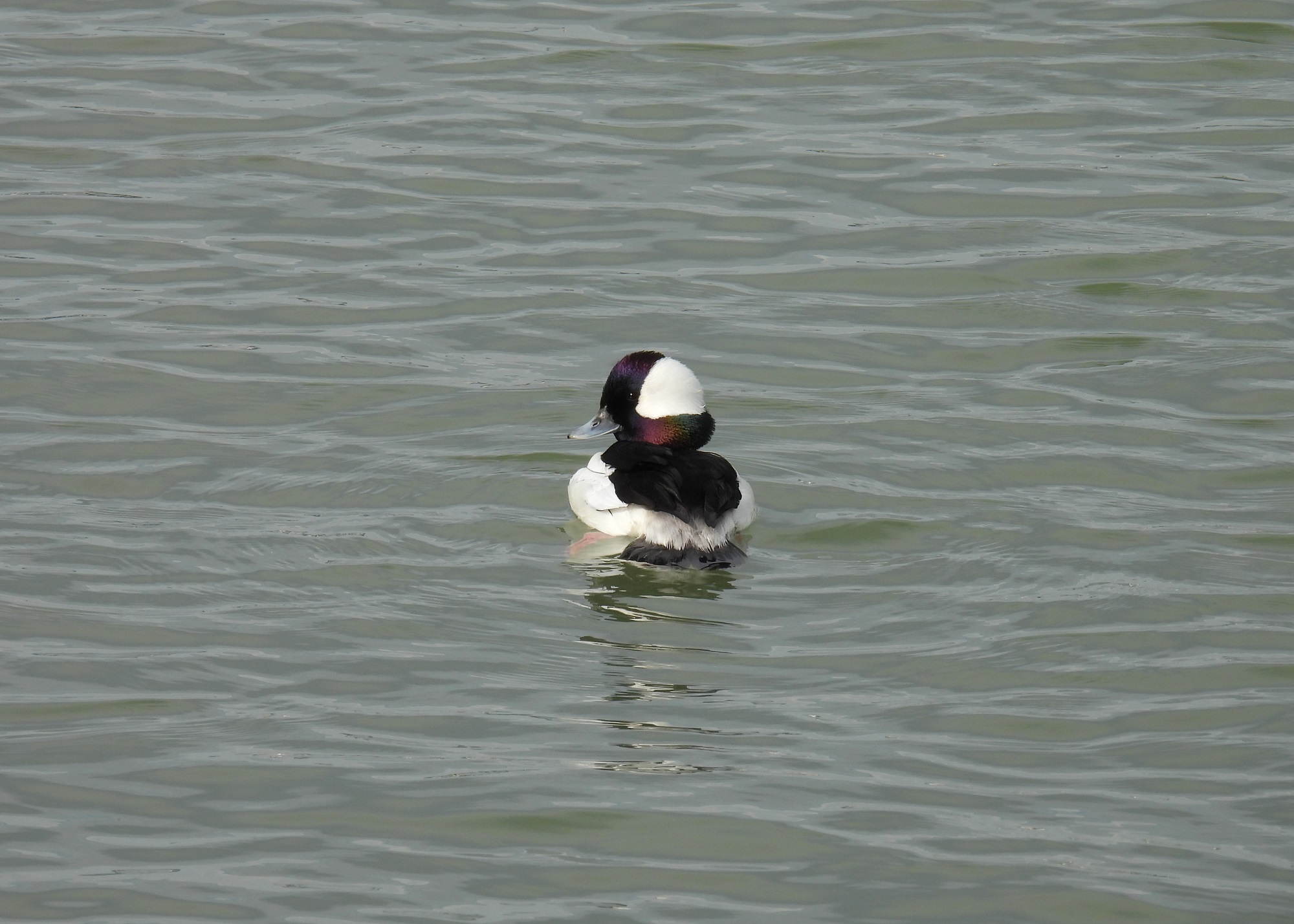 Bufflehead drake with sunlight highlighting his iridescent feathers—the photo I was hoping for