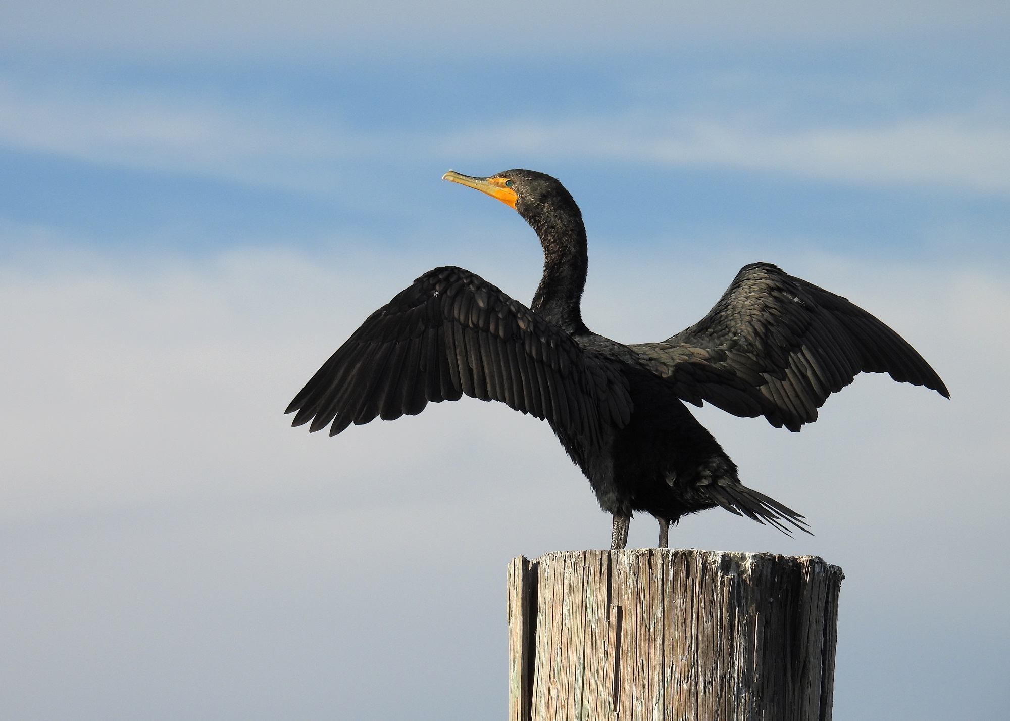 I walked further along the docks past the moored boats to where a colony of double-crested cormorants were resting. Cormorants look the part of their ancient bird species, reminding me of dinosaurs. They lack the greater amount of oil that other water birds use to keep their feathers dry and stay warm. Instead, after they’ve been diving for fish, cormorants hang their wings out to dry in the avian version of a clothesline.