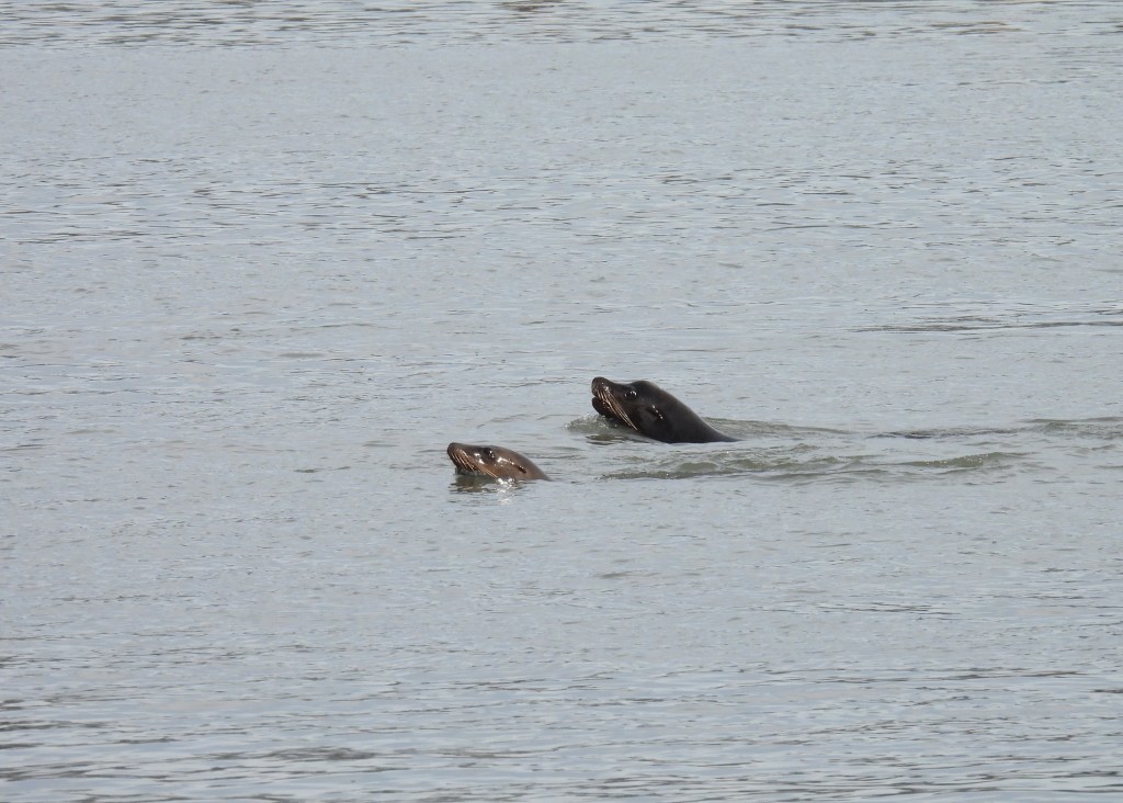 There were the sea lions, diving and surfacing, with one large male raucously vocalizing as he swam. Before today, I only heard them bark when they were resting out of the water and didn’t know they do that in the water. Or at least this guy does.
