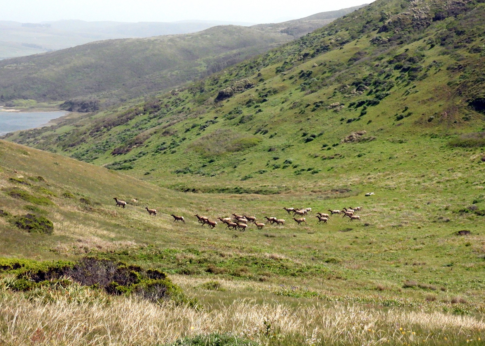 Tomales Point is a long, narrow peninsula at the western edge of North America, with a trail along the high ridgeline. It’s a place of drama throughout the seasons—biting winds, dense fog, heavy rain, battering waves against the rocks far below. It’s the home of tule elk, a subspecies found only in California, where the bulls battle each other with their giant antlers in the fall breeding season, and the watchful cows protect their calves from coyotes and mountain lions in late spring and summer.