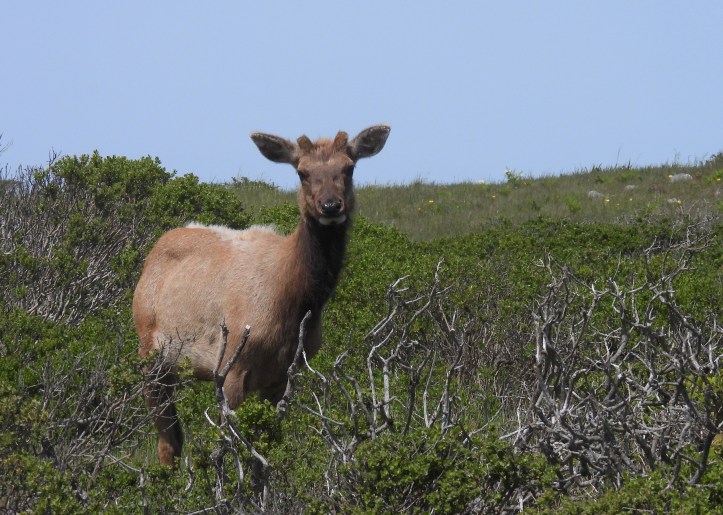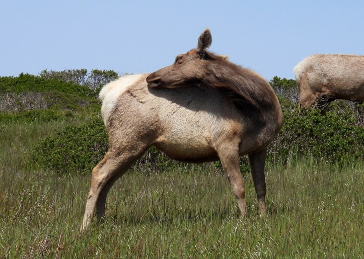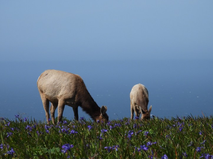 It didn’t take long for us to spot groups of elk, silhouetted against the blue ocean blurring into the sky. This time of year, the adults segregate themselves by gender. The cows with their large bellies were visibly in the late stage of pregnancy, and there were a few of last year’s calves in their herds. Used to hikers in the national park, they watched us from only a few yards away as we approached along the trail, and then returned to grazing when we stopped to gaze at them. I’m guessing they would have been alarmed if we had stepped away from the trail, but they seemed to understand there was an established route that people travel on.