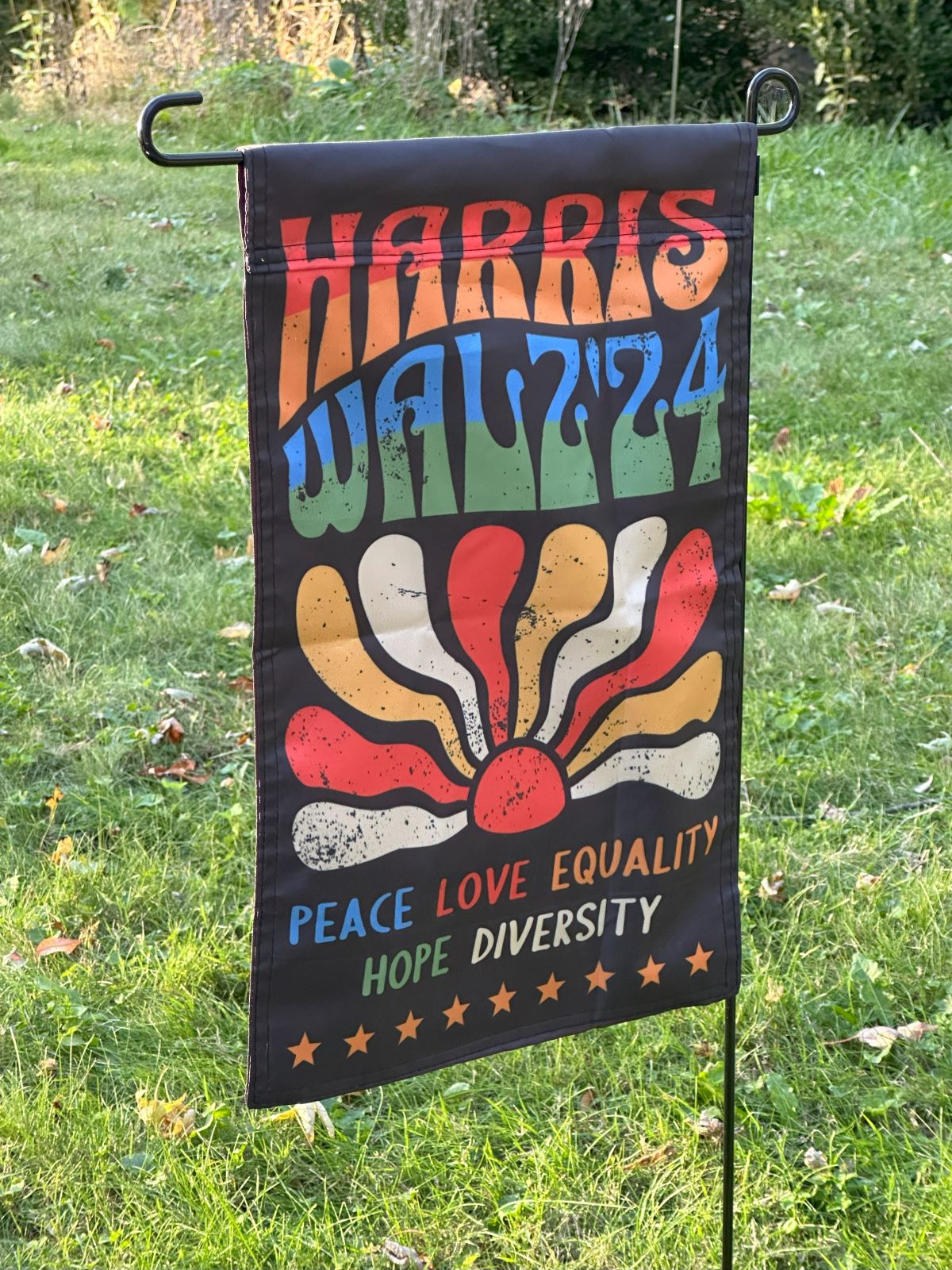 A photo of an election sign on a lawn for Harris-Walz with the statement "We're not going back."